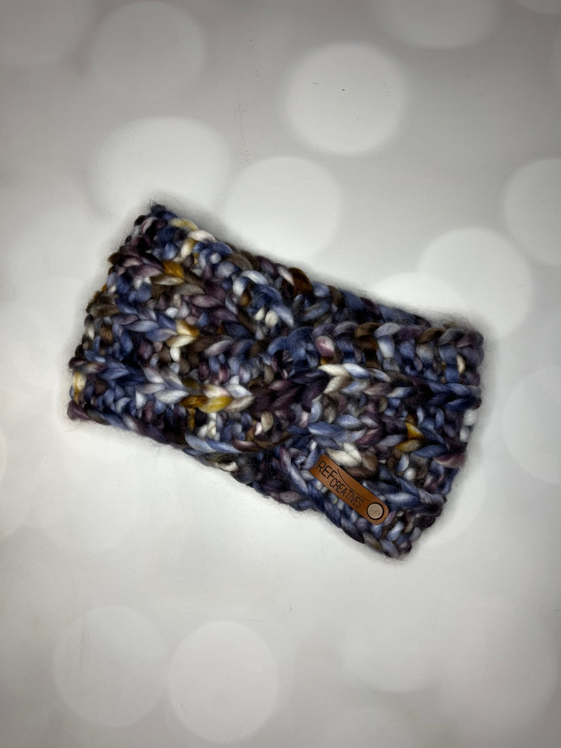 This hand knit ear warmer was lovingly handmade by me in moody fall tones of blue, brown, and white, and it has a fun twist in the center for added style. You will receive the exact ear warmer shown in the photos.
